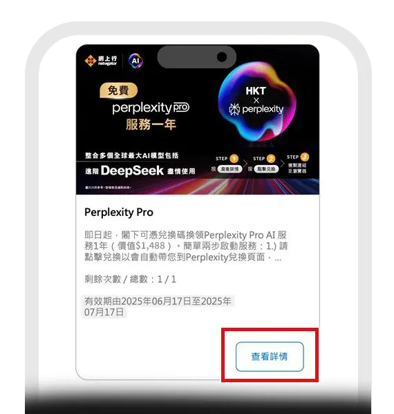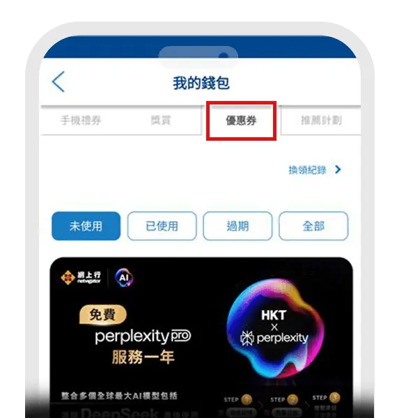 - 6. 每張電子優惠券僅限合資格用戶使用於免費兌換Perplexity Pro服務一年(「優惠」)一次。